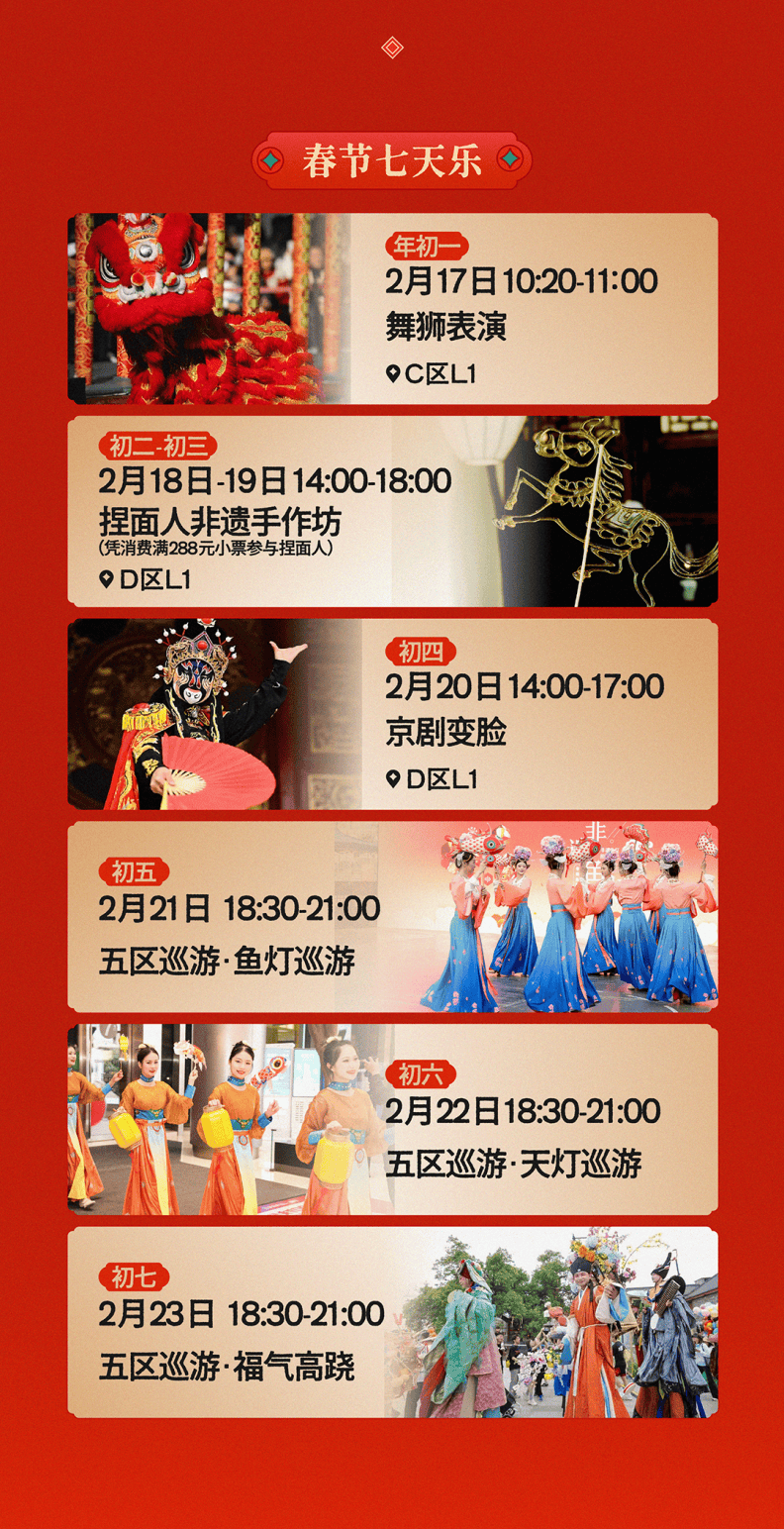 此外,初一至初七,七天乐开怀。2月17日,舞狮表演;2月18日—19日,捏面人非遗手作坊(凭消费满288元小票参与捏面人);2月20日,京剧变脸;2月21日,五区巡游·鱼灯巡游;2月22日,五区巡游·天灯巡游;2月23日,五区巡游·福气高跷。