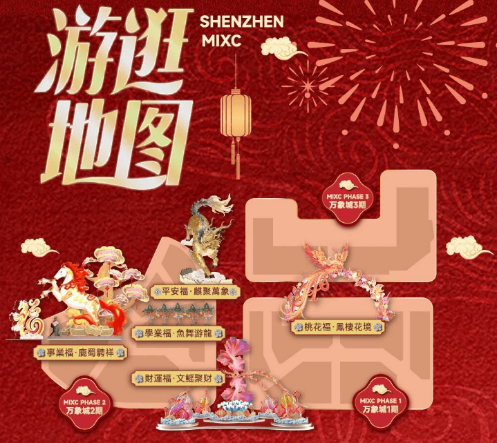 嘉年华以千年福文化为脉络,以非遗匠心为笔触,汇聚事业福·鹿蜀、财运福·文瑶、平安福·麒麟、学业福·锦鲤、桃花福·朱雀等《山海经》五福形象,在万象城一、二、三期广场设置花灯,并联动深圳万象城品牌打造潮流快闪、月老COSER巡游互动等,营造时尚、火热的新春消费氛围。