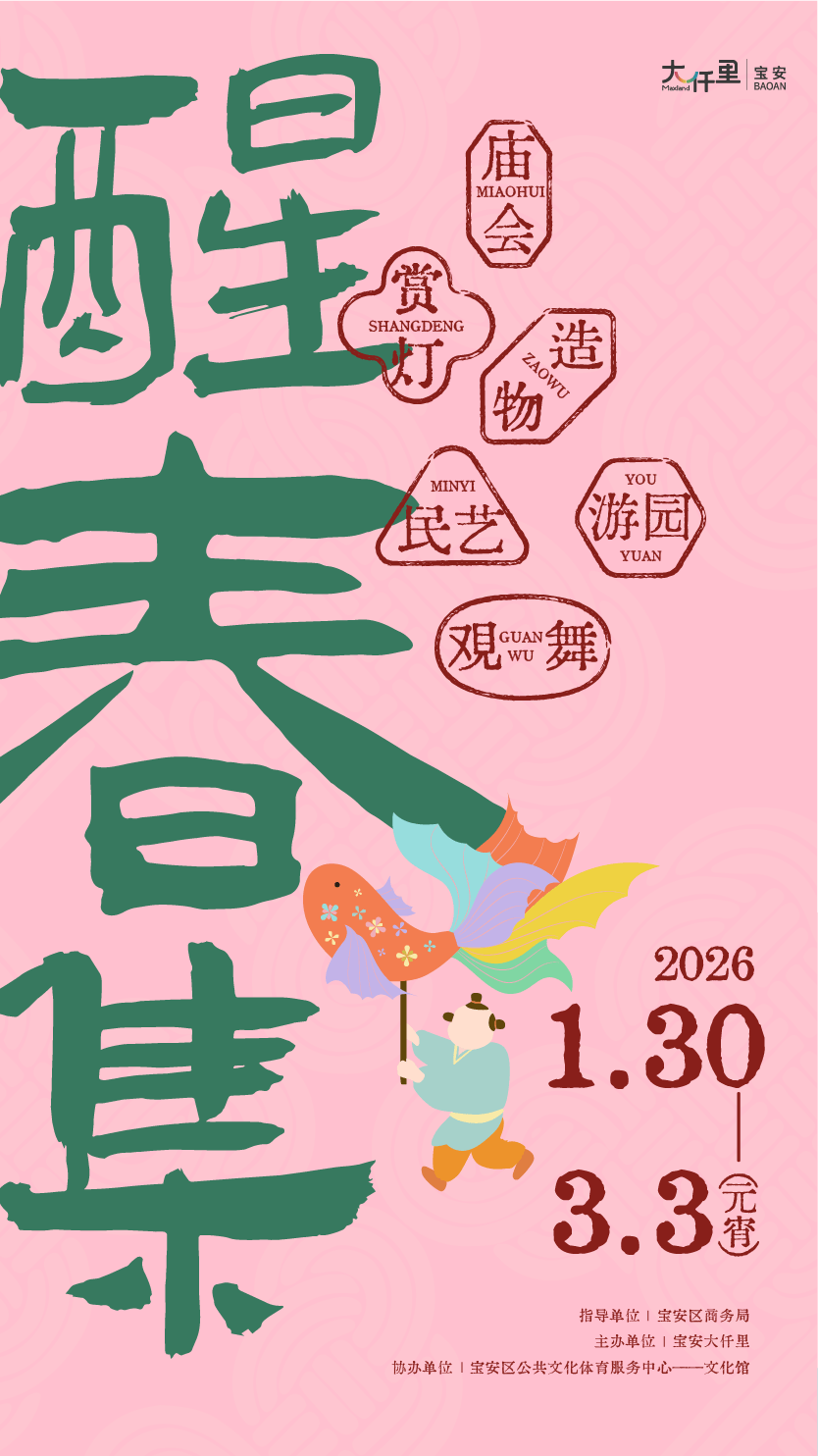 即日起至3月3日(元宵节),宝安大仟里开展首届新春文化盛宴“醒春集”活动。这是一场凝聚庙会、赏灯、民艺、造物、游园、观舞六大新春理想生活体验的盛会。在熟悉又新鲜的年俗中重拾记忆中的年味,共筑新春仪式感。超1000平方米圩集庙会,3大非遗自贡“天下第一灯”,1场灯会游园重现,2大传统民艺,2大非遗演艺元素,10场非遗手作。