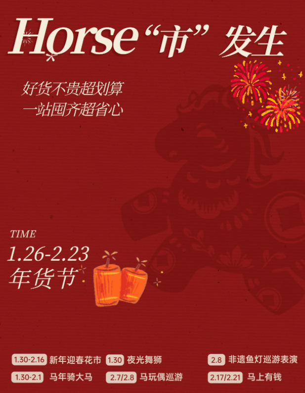 壹方天地以“壹方开喜•HORSE发生”为主题,围绕马年生肖元素,打造了集沉浸式展览、非遗市集、演艺巡游、优惠福利于一体的新春体验,让你在逛市集、品美食、玩游戏中感受浓厚年味。