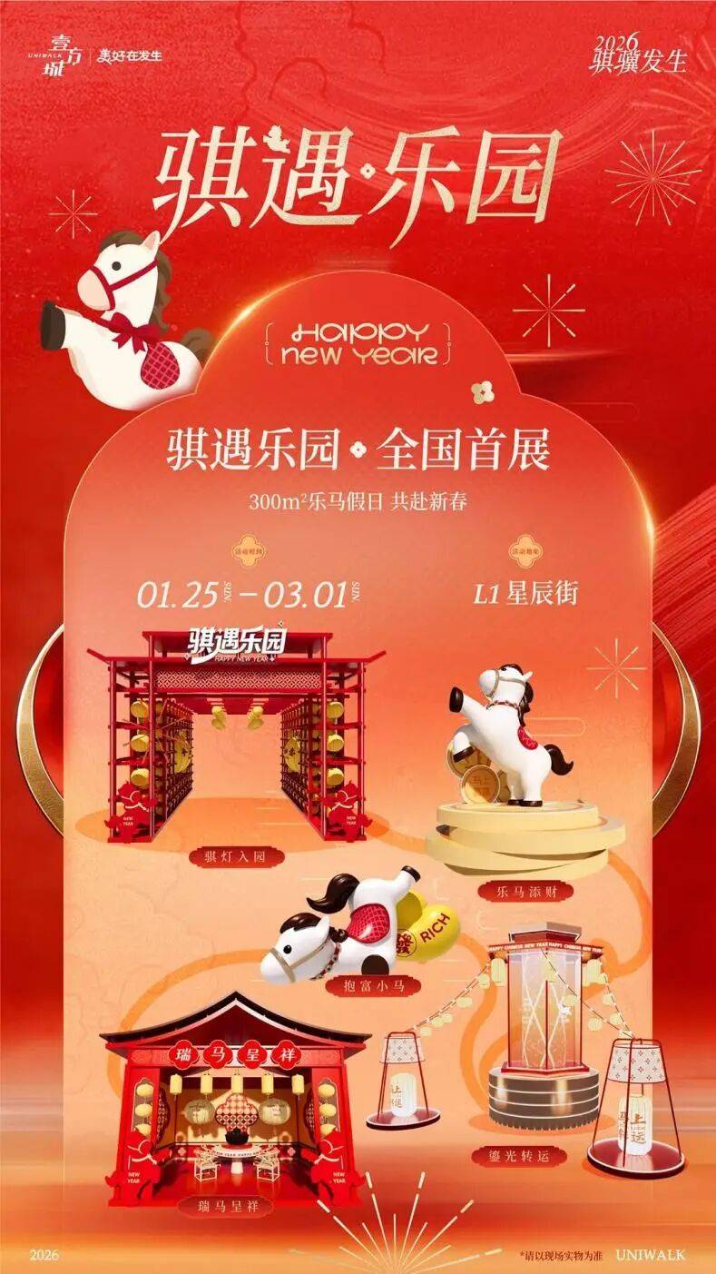 前海壹方城骐遇乐园全国首展正式启幕,持续展出至3月1日,300平方米沉浸式新春主题空间带来别样年味:乐马化身新春使者,串联非遗表演、超级大变装、巨型机甲、品牌快闪与超值福利,打造集文化体验、潮流打卡、购物狂欢于一体的新春盛会,邀大家共赴2026骐骥新岁之约。