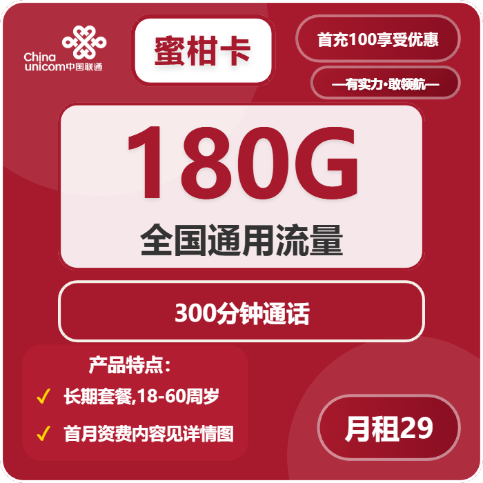 :49元/月,185G全国通用流量+100分钟通话,无定向限制,首月全价不结转,3个月合约期,适合大流量用户。