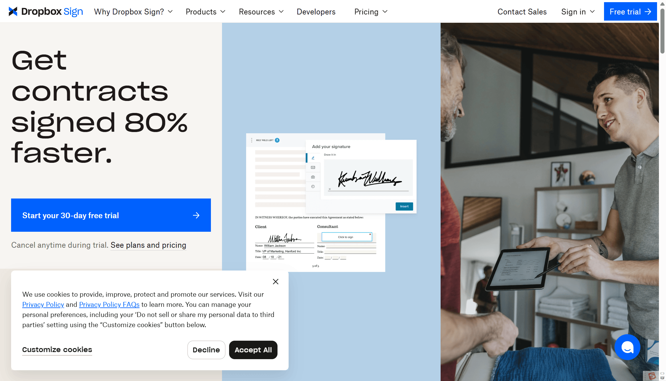 Dropbox Sign(前身为 HelloSign)是一款由 Dropbox 推出的电子签名与合同管理工具,主要面向需要简化签署流程的团队和企业。该平台符合 ESIGN Act、eIDAS 等法规,能够保障电子签名的法律效力。依托 Dropbox 的生态,它在文件管理与签署之间提供了自然的衔接,帮助用户更高效地完成合同流转。